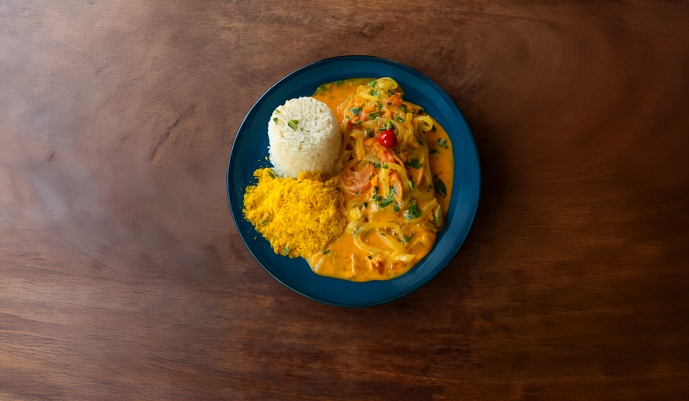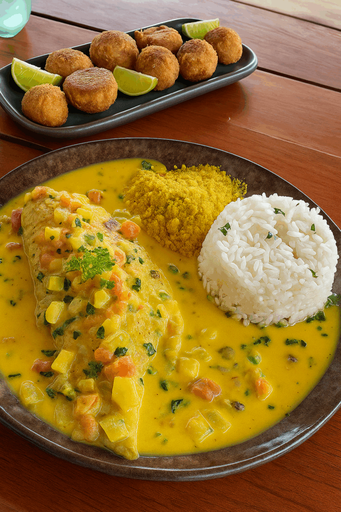 O prato vencedor, Caiçara, une peixe fresco grelhado, purê de banana-da-terra e molho de moqueca, preparados com técnicas artesanais e ingredientes da região. Um sabor autêntico que traduz a essência da culinária caiçara.